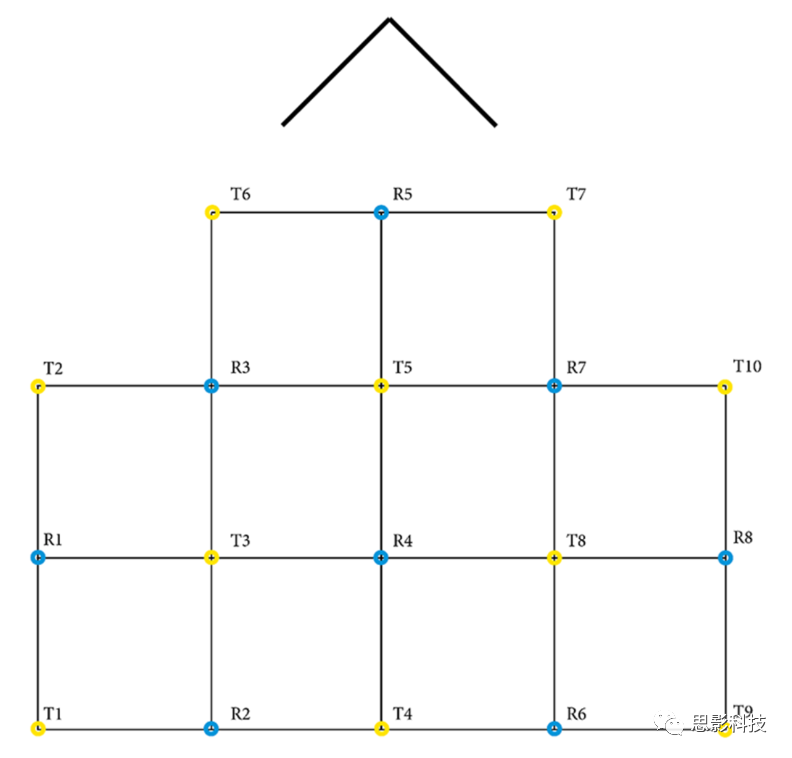 圖2.fNIRS光極分布。每個(gè)發(fā)射器(T)和接收器(R)間形成一個(gè)通道,共有10個(gè)發(fā)射器、8個(gè)接收器、27個(gè)通道。箭頭代表被試的鼻子。