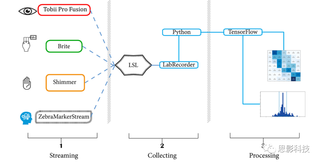 圖3.實(shí)驗(yàn)設(shè)置,左側(cè)為所有數(shù)據(jù)流:Tobii眼動(dòng)追蹤數(shù)據(jù)、Brite fNIRS數(shù)據(jù)、Shimmer GSR和PPG數(shù)據(jù)、斑馬謎題的mark。虛線(xiàn)表示到LSL的流式連接,中間部分的LabRecorder以XDF格式記錄數(shù)據(jù),右側(cè)部分顯示已處理數(shù)據(jù)的輸出示例。