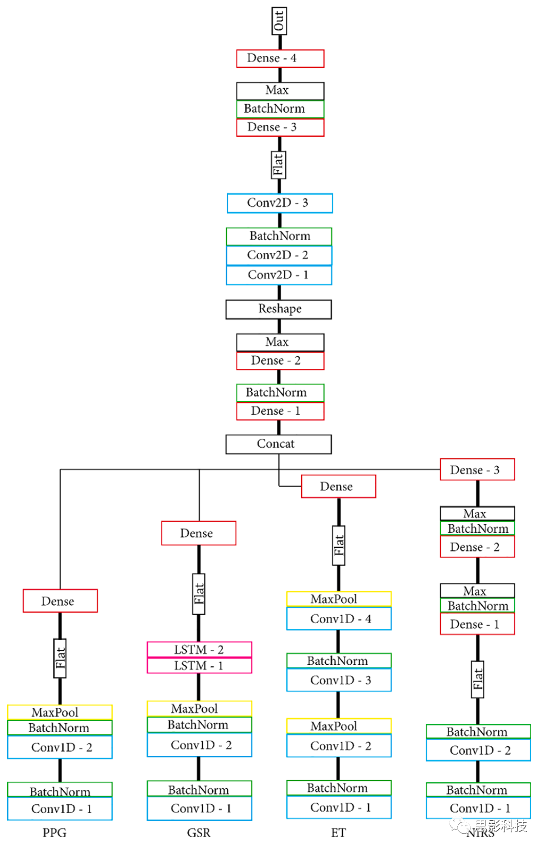 2、所需認(rèn)知資源,取決于任務(wù)難度。在Csikszentmihalyi描述的心流狀態(tài)下,人們會(huì)完全沉浸在任務(wù)中,可用認(rèn)知資源和所需認(rèn)知資源的比率(α)介于0.8到1.2之間。感知心理負(fù)荷(PMWL)是被試反應(yīng)的MWL。PMWL的自我報(bào)告通常使用NASA任務(wù)負(fù)荷指數(shù)(NASA-TLX),檢索六個(gè)工作量相關(guān)因素的量級(jí)和來(lái)源。不過(guò),主觀報(bào)告可能影響實(shí)驗(yàn)的客觀性,且會(huì)打斷受試的心流狀態(tài)。生理測(cè)量可以替代自我評(píng)估的方法,這是一種隱式測(cè)量方法(不打斷心流狀態(tài)),可以客觀、實(shí)時(shí)地獲取數(shù)據(jù),且無(wú)需由被試報(bào)告。 先前研究已使用多種生理信號(hào)在單模態(tài)場(chǎng)景下分類(lèi)PMWL,例如功能性近紅外腦血氧成像(fNIRS)、皮膚電反應(yīng)(GSR)和心率(HR),上述信號(hào)都可以有效單獨(dú)分類(lèi)PMWL。本研究結(jié)合單模態(tài)與多模態(tài)信息分類(lèi)PMWL,確定哪些生理信號(hào)提供的信息對(duì)分類(lèi)有價(jià)值。我們還制定了深度學(xué)習(xí)多模態(tài)信號(hào)分類(lèi)場(chǎng)景下的設(shè)計(jì)原則,原則可用于制定中間融合多模態(tài)網(wǎng)絡(luò)(intermediate fusion multimodal network,