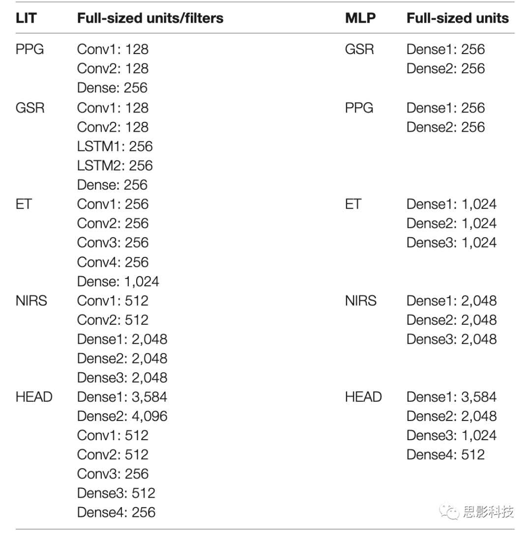 表1.模型、層以及每層的單元/過(guò)濾器數(shù)量。LIT指基于文獻(xiàn)的模型,MLP指僅包含密集連接層的模型,表格顯示全尺寸模型的信息,半尺寸模型每層單元/過(guò)濾器數(shù)量減半。