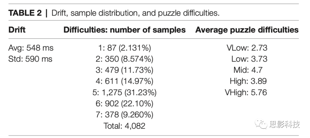 表2.評(píng)級(jí)分布。第二列為被試報(bào)告7點(diǎn)難度等級(jí)中各難度的問(wèn)題數(shù)量,第三列為不同難度問(wèn)題的難度評(píng)分均值。