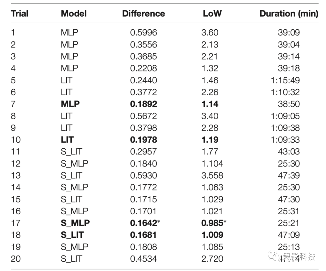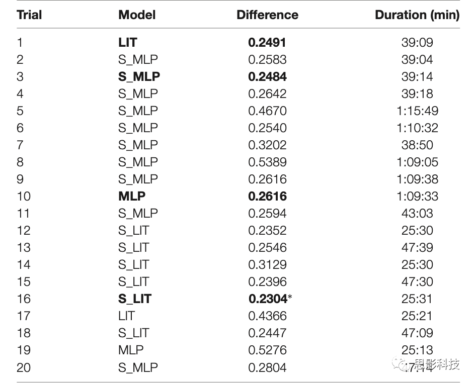 表3.各trial的最佳模型、預(yù)測(cè)-真實(shí)值差異、對(duì)應(yīng)LoW、訓(xùn)練用時(shí)