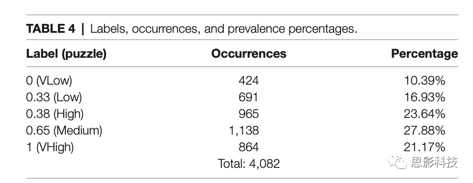 樣本總數(shù)為4082,平均每位被試185.5個(gè)樣本(77-345個(gè))。表2中可以看到樣本難度評(píng)級(jí)的分布,被試最常報(bào)告的謎題難度為5/7,其次是6/7,他們很少認(rèn)為謎題是最簡(jiǎn)單(1/7)或最難(7/7)的。使用Cronbach's alpha評(píng)估標(biāo)簽的一致性,假設(shè)問(wèn)題是測(cè)試項(xiàng),alpha為0.74;假設(shè)被試報(bào)告是測(cè)試項(xiàng),alpha為0.97。