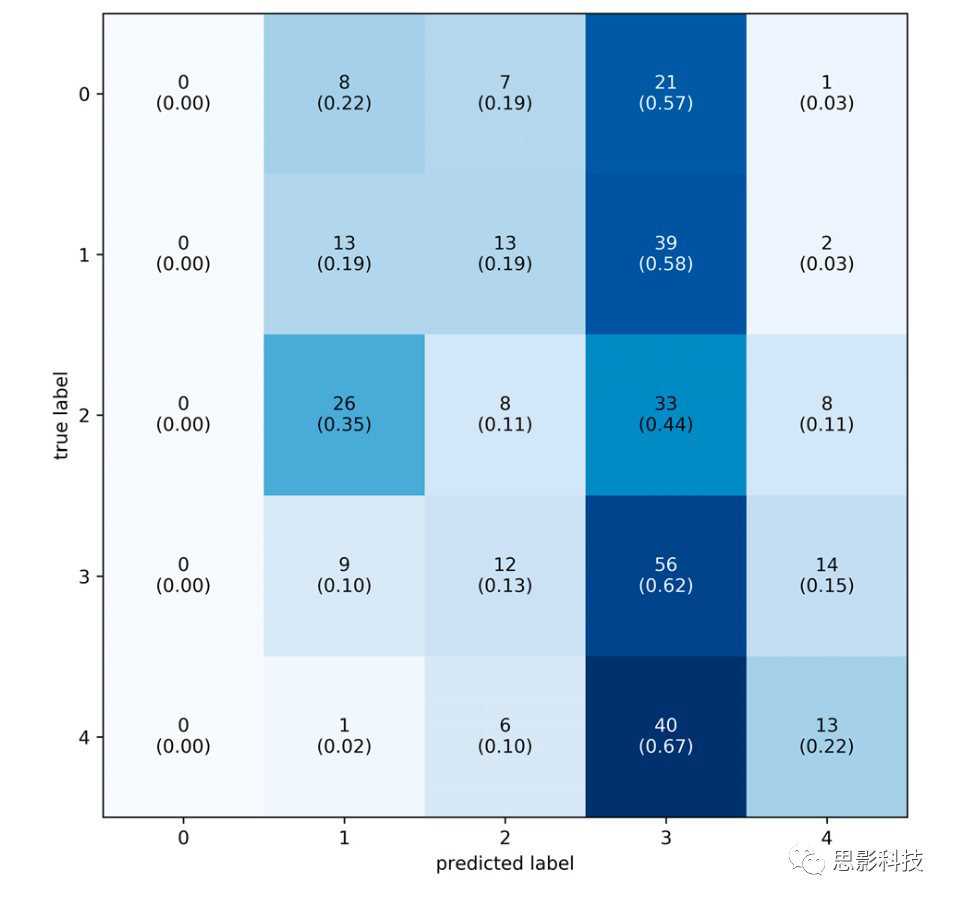 圖9.組標(biāo)簽的混淆矩陣。標(biāo)簽從0到4,共五個(gè)級(jí)別。每個(gè)方塊包含預(yù)測(cè)標(biāo)簽次數(shù)、預(yù)測(cè)標(biāo)簽占比(括號(hào))。大多數(shù)預(yù)測(cè)標(biāo)簽在第四級(jí)難度(高難度)。