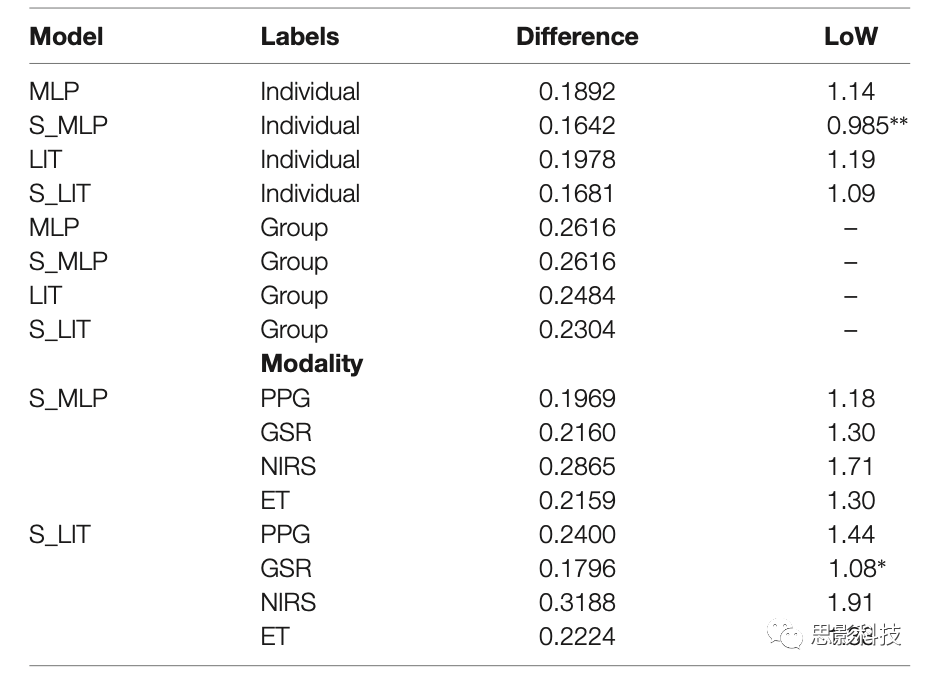 為了研究附加模式的價(jià)值,我們還評(píng)估單模式的表現(xiàn)。所有模型使用已證明對(duì)目標(biāo)模態(tài)最有效的超參數(shù)進(jìn)行訓(xùn)練,使用個(gè)體標(biāo)簽。測(cè)試結(jié)果見(jiàn)表6,S_MLP模型中PPG表現(xiàn)最佳,預(yù)測(cè)與真實(shí)標(biāo)簽之間的平均差異為0.1969(1.18LoW)。GSR和S_LIT模型實(shí)現(xiàn)單模態(tài)的最佳整體表現(xiàn),差異為0.1796(1.08LoW)。fNIRS模態(tài)在兩種模型上的表現(xiàn)最差,S_MLP和S_LIT的結(jié)果分別為0.2865(1.71LoW)和0.3188(1.91LoW)。