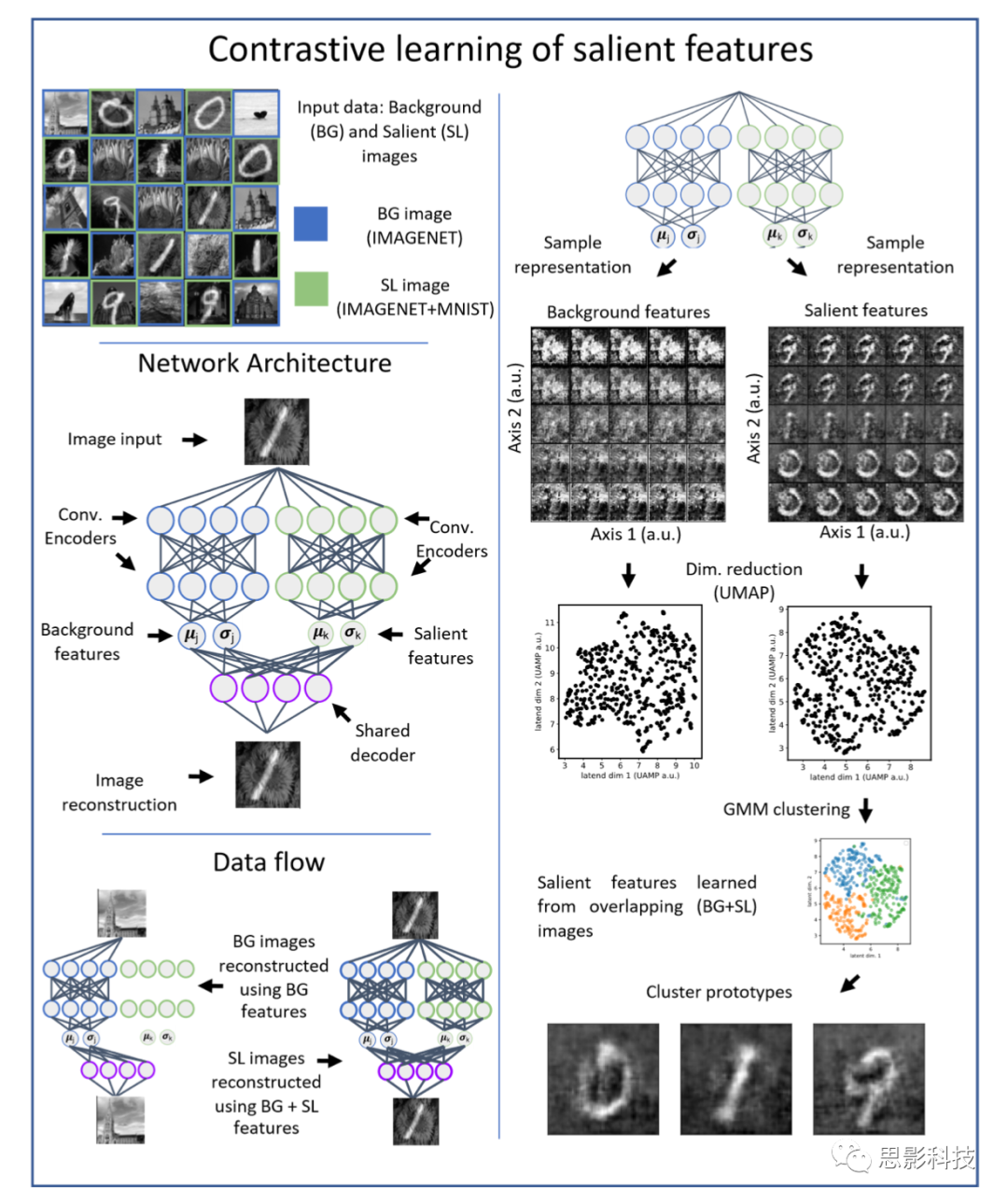 合成數(shù)據(jù)包括背景圖像(從ImageNet數(shù)據(jù)集中選擇)和目標圖像(將MNIST手寫數(shù)字數(shù)據(jù)集疊加到ImageNet圖像數(shù)據(jù)集上創(chuàng)建而成)組成。對比變分自動編碼器(CVAE)是一個雙流神經(jīng)網(wǎng)絡,用于提取共享的和目標特定特征。背景圖像使用共享特征重建,而目標圖像利用共享特征和目標特定特征共同創(chuàng)建,因此CVAE學習了不同的共享特征和特定于目標的特征。聚類結果顯示,所使用的MNIST數(shù)字(0、1和9)由不同的潛在特征表示。