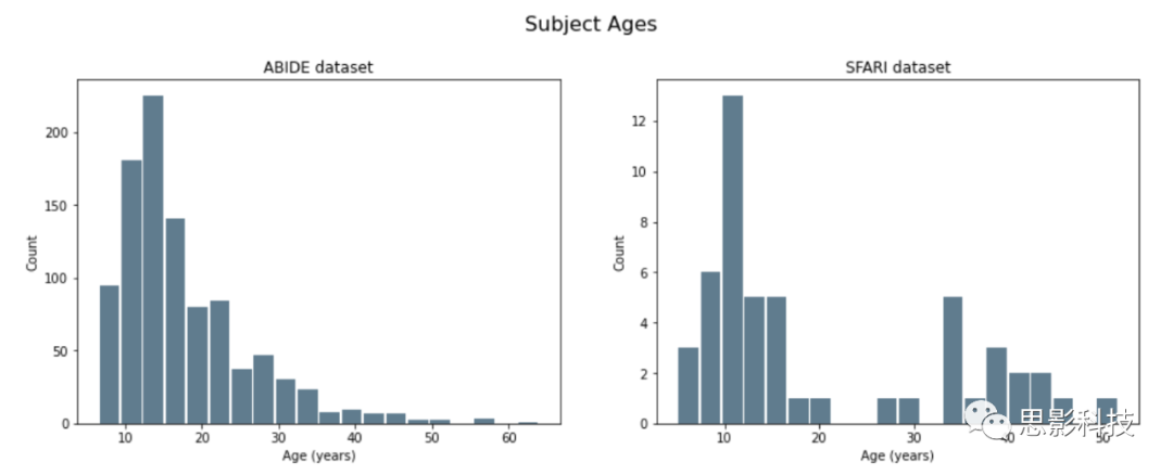 本研究使用到兩個數(shù)據(jù)集:ABIDE I和SFARI VIP,共計1112名被試,包括539名ASD被試(65名女性)和573名TC(典型控制組)被試(99名女性)。ABIDE I數(shù)據(jù)集是從17個數(shù)據(jù)掃描中心收集獲得,其中TC組的年齡在6-56歲之間,ASD組的年齡在7-64歲之間。MRI數(shù)據(jù)集共有341名被試,其中235名被試確認了基因拷貝數(shù)變異。兩個數(shù)據(jù)集中被試的年齡分布如圖S6所示。