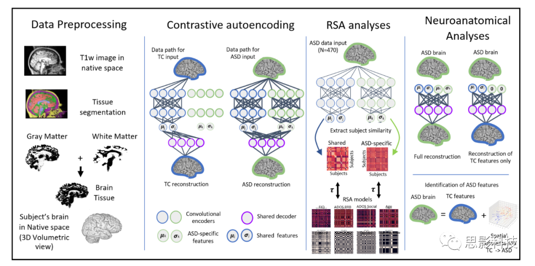 自閉癥(ASD)是一種具有高度異質(zhì)性的精神疾病,識別神經(jīng)解剖學的個體差異可以為ASD的診斷和干預提供有用的信息,但是解決這個問題所面臨的挑戰(zhàn)在于個體差異與其他原因導致的變異混合在一起。本研究利用機器學習中對比學習的方法揭示自閉癥(ASD)中神經(jīng)解剖學變異結構,將ASD特有的神經(jīng)解剖學變異結構與典型對照組共有的變異結構分開,ASD特有的變異結構與癥狀的個體差異有關,這種ASD特有的變異結構也解決了關于ASD的一個長期爭論,至少在神經(jīng)解剖學方面,個體不會聚集成不同的亞型;相反,它們是沿著連續(xù)的維度組織的,影響著不同的腦區(qū)。可結合以下腦影像機器學習相關文章閱讀,加深理解,感謝幫轉支持(直接點擊,即可瀏覽,加微信號siyingyxf或18983979082獲取原文及補充材料):