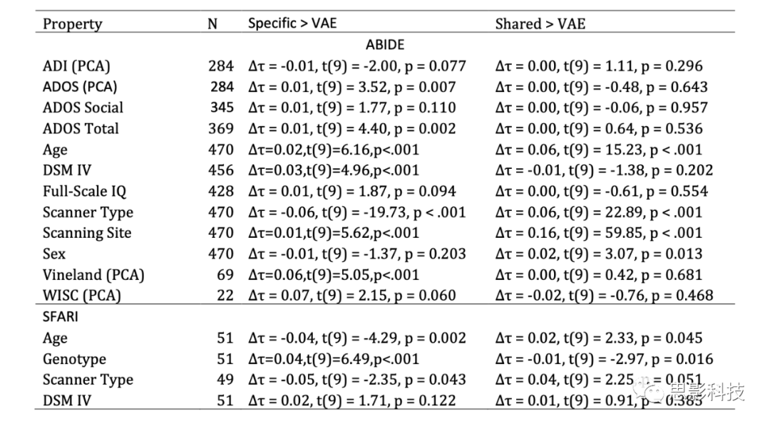 正如預期的那樣,掃描儀類型與共享特征中被試之間的相似性相關(τ=0.11, t9=253.01, p<0.001),但與ASD特異性特征無關(τ=-0.01, t9=-14.16, p<0.001;共享與特異性差值:Δτ=0.12, t9=124.83, p<0.001)。因此,CVAE能夠排除多中心數(shù)據(jù)中的變異來源,相比之下,ASD臨床癥狀與ASD特異性特征相關,但與共享特征無關。這些包括與DSM IV的行為亞型的相關性(ASD特異性特征: τ=0.06, t9=30.83, p<0.001; 共享特征: τ=0.02, t9=29.02, p<0.001; 差異: Δτ=0.04, t9=20.04, p<0.001),與ADOS評分的相關性(ASD特異性特征: τ=0.01, t9=16.85, p<0.001; 共享特征: τ=0.00, t9=-1.50, p=0.167; 差異: Δτ=0.01, t9=11.59, p<0.001)和與Vineland適應行為量表的相關性(ASD特異性特征: τ=0.05, t9=12.33, p<0.001; 共享特征: τ=0.00, t9=1.17, p=0.270; 差異: Δτ=0.05, t9=10.46, p<0.001。見圖S4)。