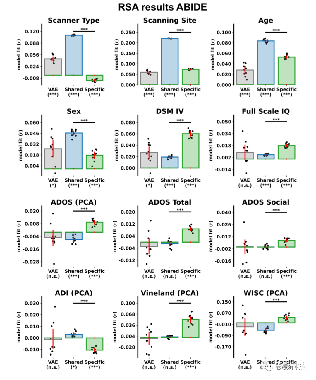 在CVAE訓練過程中,作者使用一種受表征相似性分析(RSA)啟發(fā)的方法來探究潛在特征。作者根據(jù)不同的人口統(tǒng)計學變量和個體行為學指標計算被試之間的相似性,對于人口統(tǒng)計學變量,如年齡和全尺度智商(FIQ),被試間距離是它們之間歐氏距離的絕對值(即年齡差異或FIQ得分差異)。對于類別變量(如性別或掃描中心,結果為0或1),如果兩個被試分類變量之間互相匹配(即擁有相同的性別或相同的掃描地點),被試間的距離為0,否則為1。對于個體行為學屬性(如Vineland、WISC和ADOS評分,見圖1),作者使用主成分分析(PCA)并計算了第一個主成分負荷的絕對差異。對于ADOS評分,作者包括了總分,以及從單個ADOS中計算出的第一個主成分。為了構建RSA模型,作者使用了來自所有該屬性上有評分的被試的數(shù)據(jù)(例如ADOS總評分,Vineland,見表S3)。