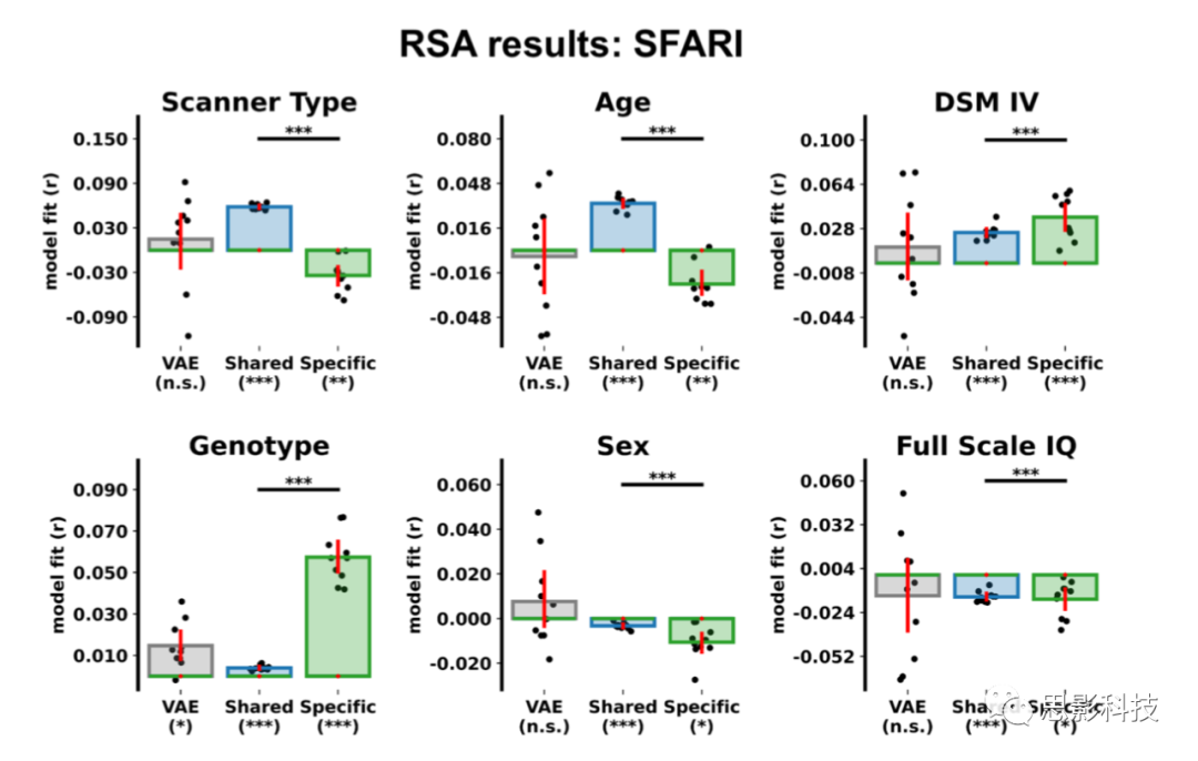 圖S5. 表征相似性分析(RSA)結果(SFARI數(shù)據(jù)集)。柱狀圖顯示了神經(jīng)解剖學特征(VAE、CVAE共享和CVAE ASD特異性)和患者屬性之間的表征相似性。(* p < .05, ** p < .001, *** p < .0001).