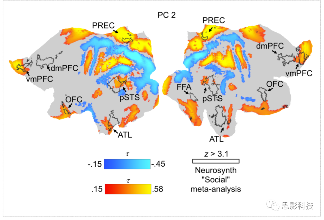 圖S9. 與第二個主成分(PC2)相關的神經(jīng)解剖學擴張/收縮的區(qū)域。黑色輪廓顯示了Neurosynth.org自動分析搜索詞語“社會”后顯著的(z>3.1)區(qū)域。