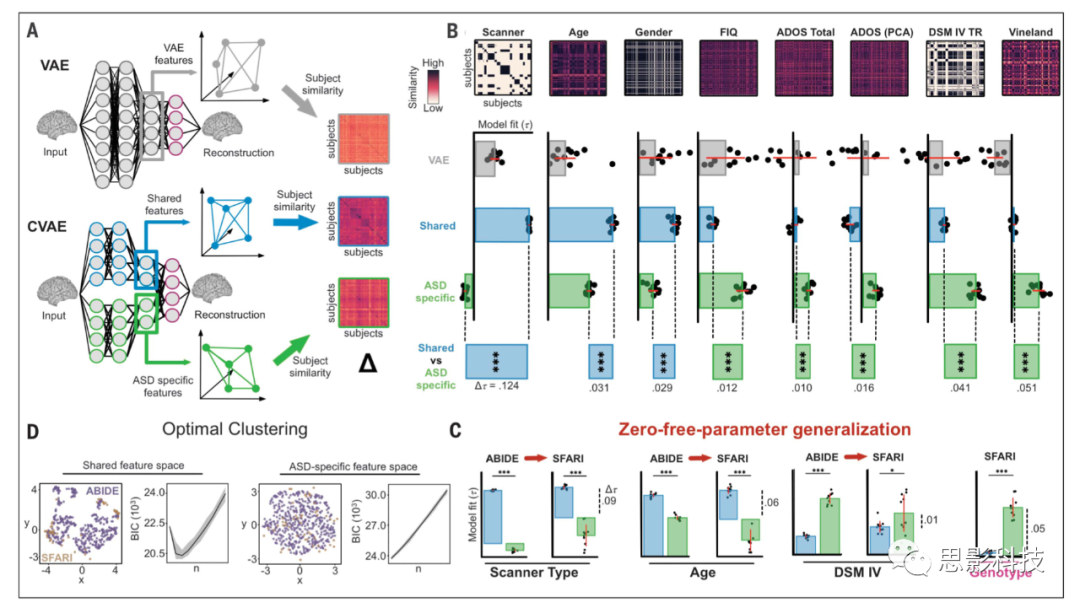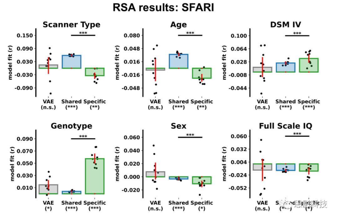 RSA(表征相似性)分析:為了探究潛在特征中的信息,作者將共享特征和ASD特異性特征被試之間的相似性與來自行為、人口統(tǒng)計學和遺傳數(shù)據(jù)的相似性模型進行比較。