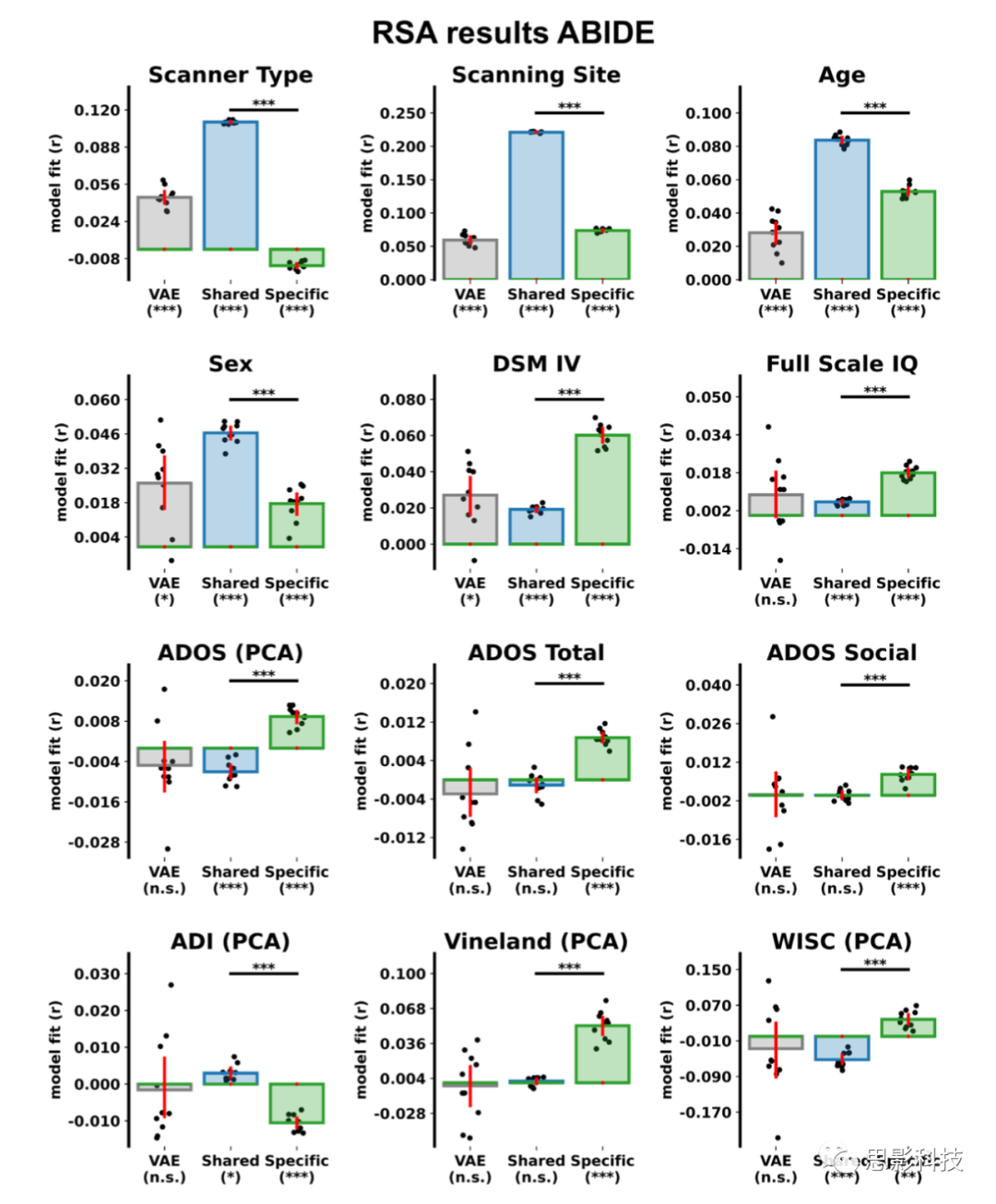 圖S4. 表征相似性分析(RSA)結果(ABIDE數(shù)據(jù)集)。柱狀圖顯示了神經(jīng)解剖學特征(VAE、CVAE共享和CVAE ASD特異性)和被試屬性之間的相似性,星號表示的顯著性(*p<.05,***p<.0001)。