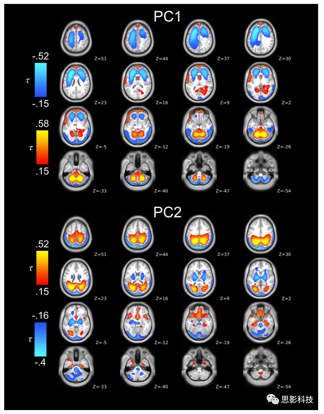 (B)區(qū)域顯示體積增加(紅色)和減少(藍色)與兩個PC相關,白質(zhì)效應報見圖S8。