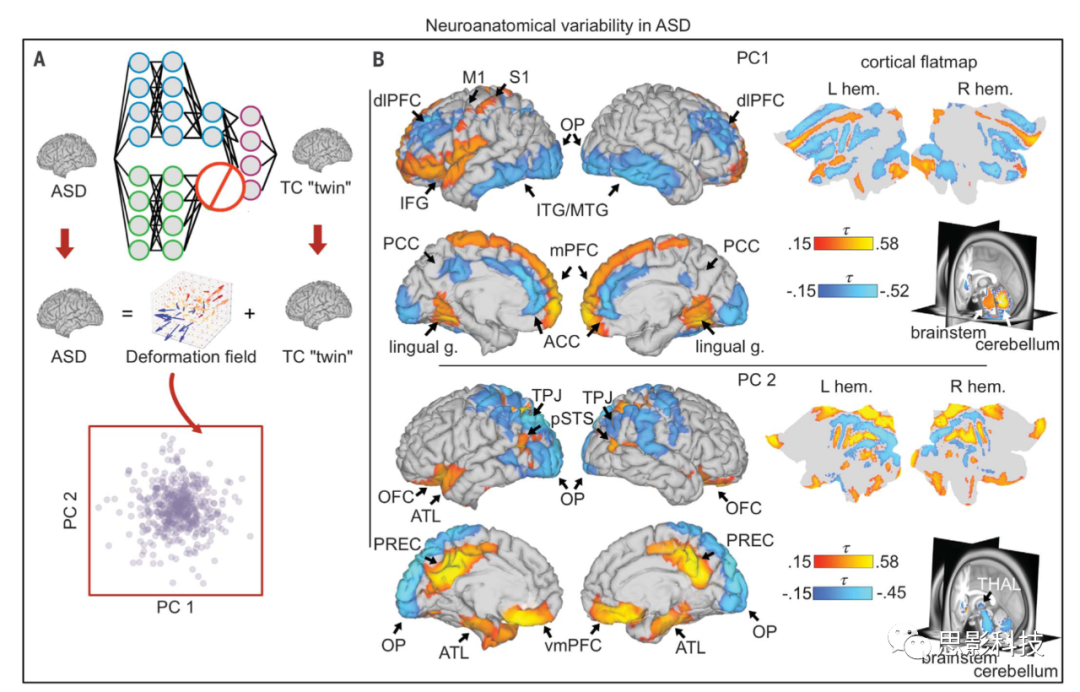 (A)對于每個ASD被試,作者計算了一個匹配ASD共享特征的合成TC雙胞胎大腦,并將其改變?yōu)橄鄳?/span>ASD大腦,獲得一個變形場。然后,作者將PCA(主成分)應用于被試之間變形場的雅可比矩陣行列式。