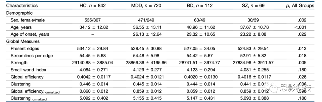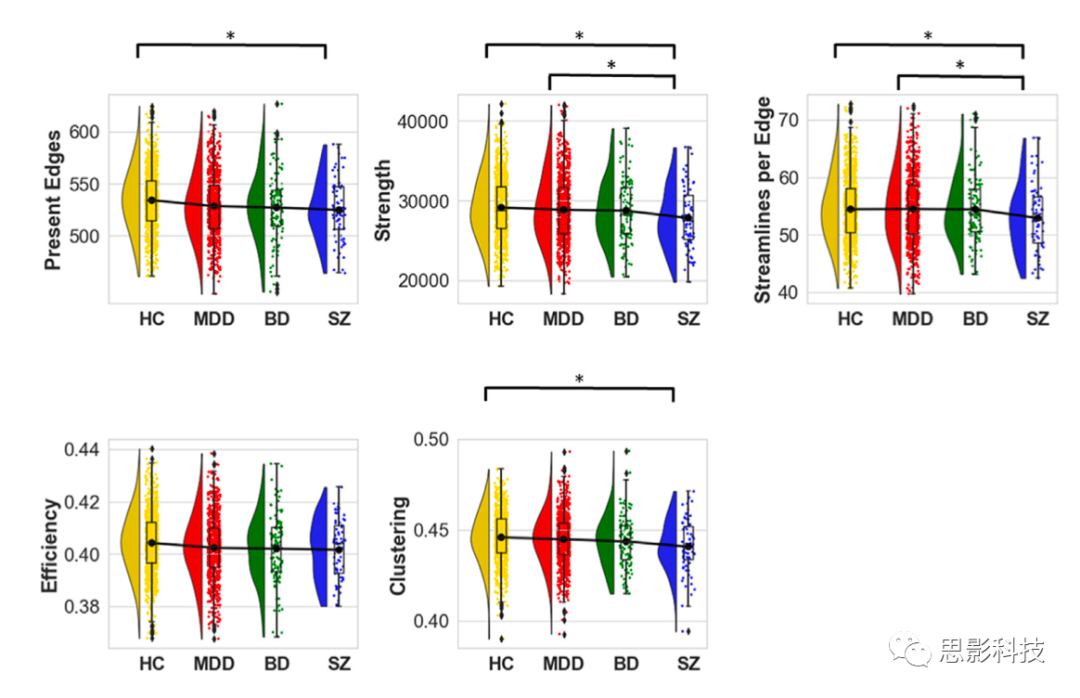 我們展示了SZ、BD和MDD的共同和特定的結(jié)構(gòu)性白質(zhì)連接障礙的特征,導(dǎo)致網(wǎng)絡(luò)效率普遍降低。這些結(jié)果表明,在一系列主要的精神障礙中,大腦通信受到了損害。