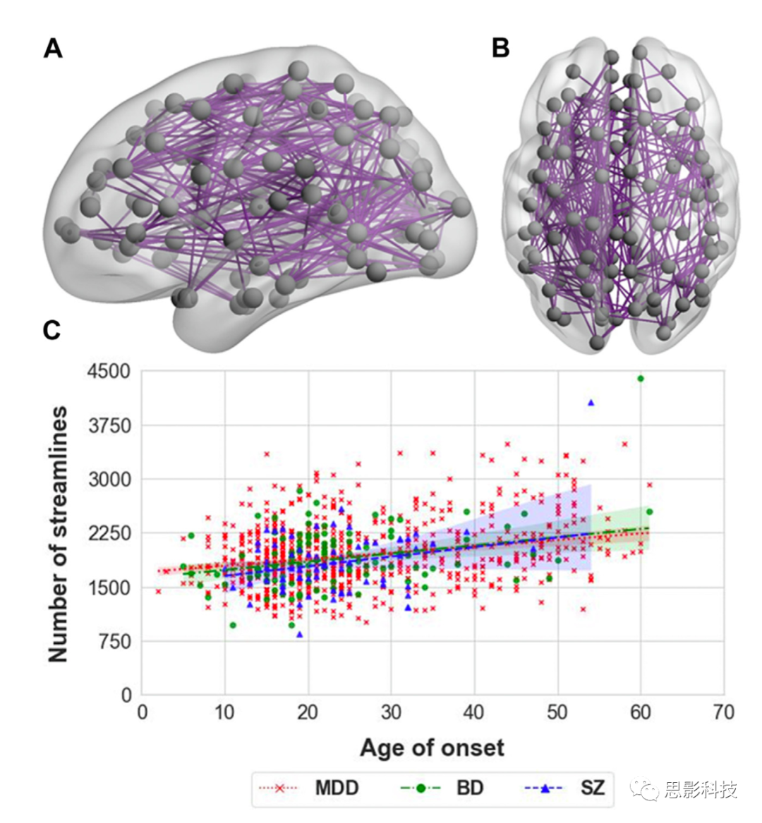 A:矢狀視圖。B:軸向視圖。C:散點(diǎn)圖,描繪了發(fā)病年齡和從顯著簇中提取的流線總數(shù)之間的關(guān)系。