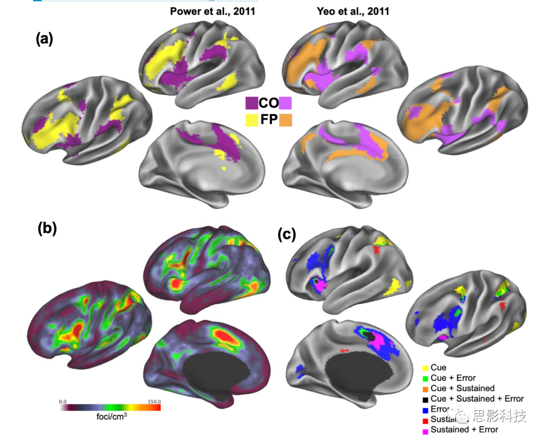 (b) CO和FP區(qū)域是不同任務(wù)中最常見的激活位點。這張圖(改編自Nelson et al., 2010)顯示了來自1000多個不同研究的激活位點的空間重疊。