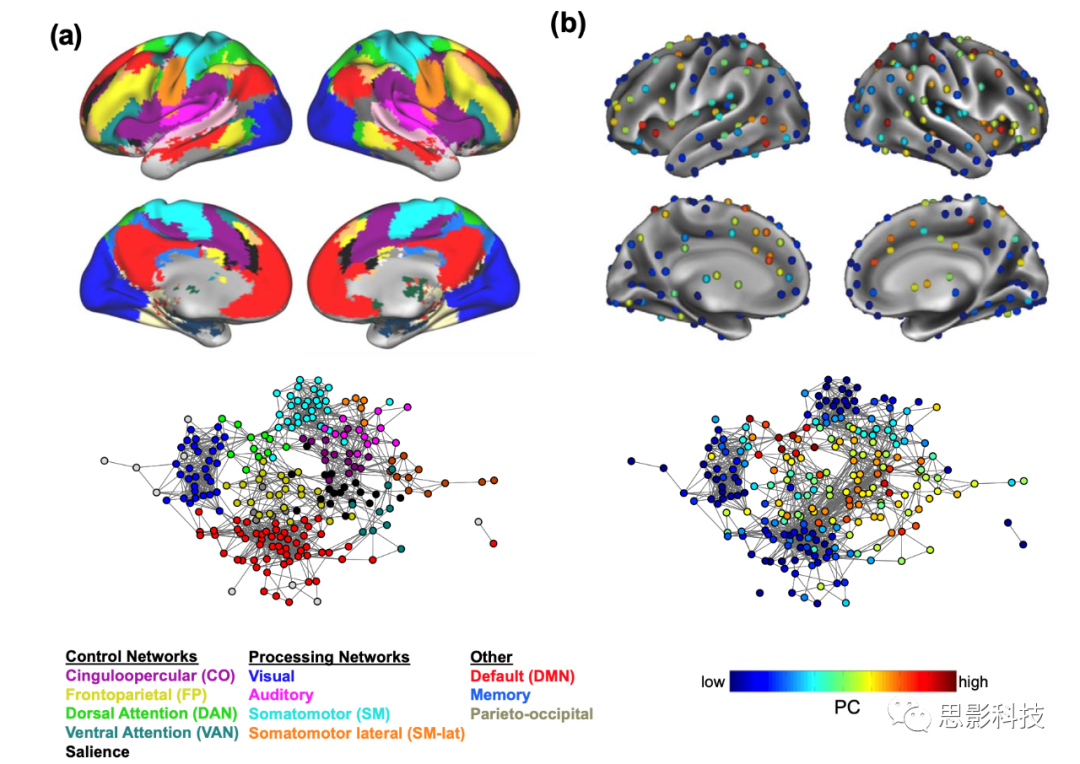 (b)圖論測量也可以用來更好地理解在整個大腦的多個網(wǎng)絡(luò)背景下的跨網(wǎng)絡(luò)交互。在這個框架內(nèi),某些大腦區(qū)域(連接樞紐)充當中介跨網(wǎng)絡(luò)交互的站點。這些區(qū)域可以通過使用參與系數(shù)(PC)度量來識別,該度量度量了節(jié)點連接在不同網(wǎng)絡(luò)中的分布。正如所示,高PC(參與系數(shù))區(qū)域在控制網(wǎng)絡(luò)中被大量發(fā)現(xiàn),但不是唯一的,并可能作為調(diào)節(jié)基于自上而下目標的基本處理的完整站點。