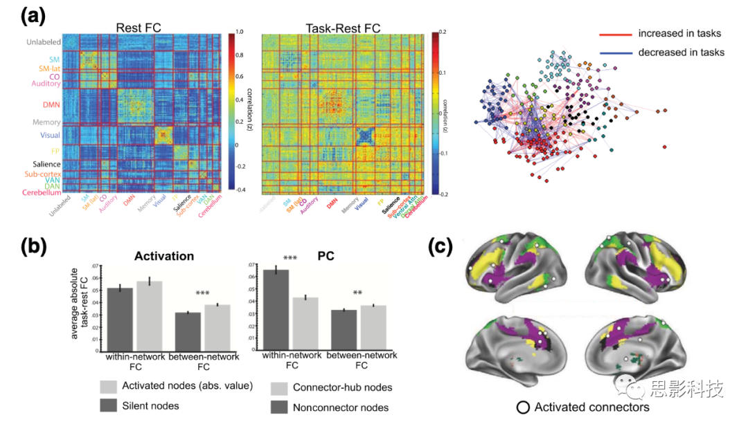 (b)左圖:任務(wù)激活區(qū)域,特別是網(wǎng)絡(luò)之間的功能連通性變化較大。右圖:像激活區(qū)域一樣,連接器hubs顯示了更多的微調(diào)調(diào)制,連接器hubs顯示了高度變化的網(wǎng)絡(luò)之間的功能連接,但另外顯示了相對穩(wěn)定的網(wǎng)絡(luò)內(nèi)功能連接。