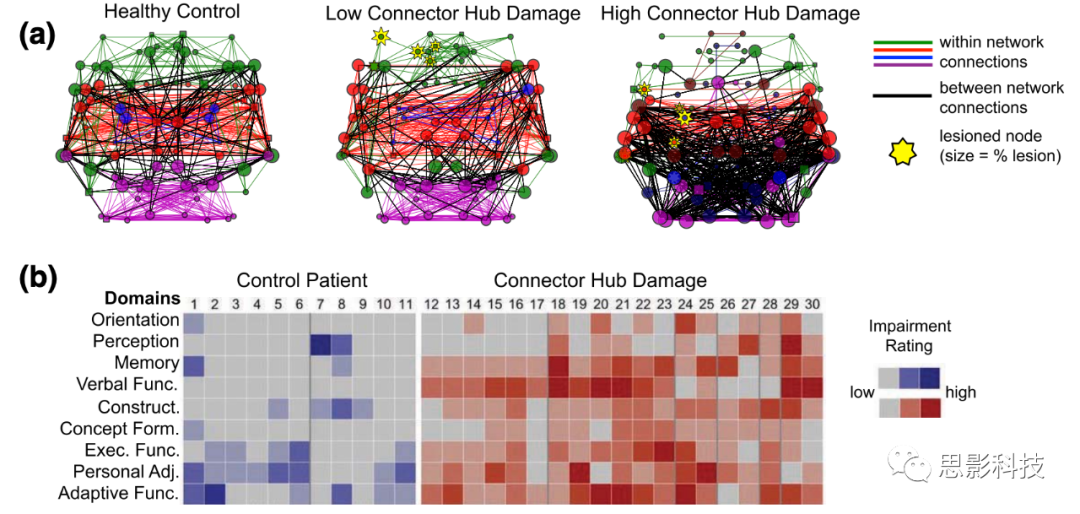 (a)我們通過觀察高或低連接器hubs損傷患者的rs-FC來檢查連接器hubs損傷如何影響大腦網(wǎng)絡(luò)組織。每一列顯示了一個腦網(wǎng)絡(luò)示例,分別來自健康對照患者(左)、連接器hubs損傷程度較低的患者(中)和連接器hubs損傷程度較高的患者(右;這兩名患者的損傷總量大致相當)。黑線標記著網(wǎng)絡(luò)之間的連接,大量的黑線表明大腦在不同的網(wǎng)絡(luò)中劃分得不好。連接hubs的損傷極大地改變了大腦網(wǎng)絡(luò)組織,降低了整個大腦網(wǎng)絡(luò)的完整性。