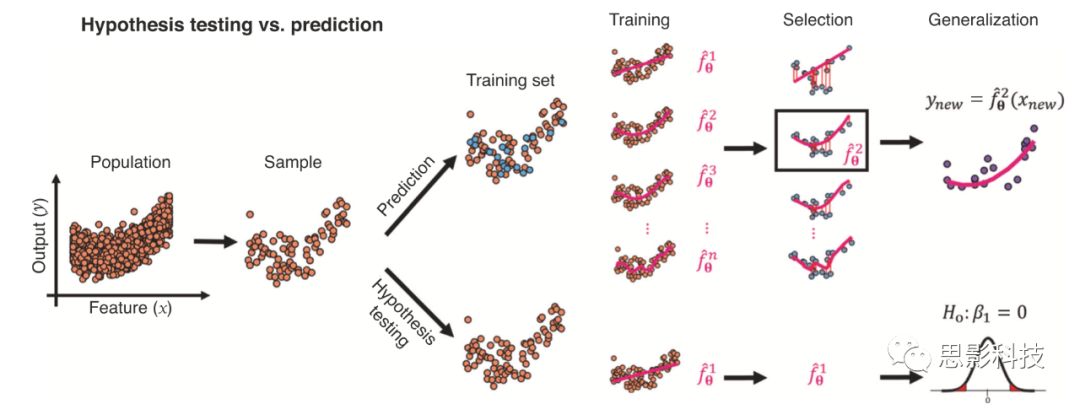 經(jīng)典統(tǒng)計(jì)假設(shè)檢驗(yàn)(底部路徑)是從總體中抽取隨機(jī)樣本,并估計(jì)模型的參數(shù)。然后根據(jù)模型參數(shù)對(duì)關(guān)于總體的假設(shè)進(jìn)行檢驗(yàn)。相比之下,在預(yù)測(cè)方面,我們應(yīng)該尋找在新樣本(紫色點(diǎn))中預(yù)測(cè)結(jié)果最好的模型。因此,與其在一個(gè)先驗(yàn)?zāi)P蜕洗_定一個(gè)被認(rèn)為能描述真實(shí)總體的統(tǒng)計(jì)特性,不如訓(xùn)練多個(gè)模型,以便在一個(gè)獨(dú)立的驗(yàn)證集(藍(lán)點(diǎn))上選擇損失最小的模型。