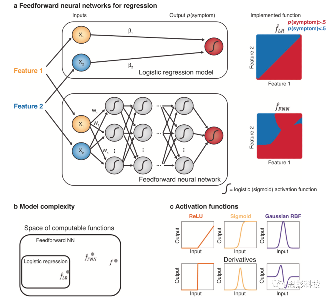 a.邏輯回歸模型(上)和FNN模型(下)的示意圖。邏輯回歸模型通過(guò)邏輯(sigmoid)型函數(shù)直接映射加權(quán)輸入,而FNN首先通過(guò)非線性的激活函數(shù)將加權(quán)輸入在多個(gè)階段中傳播。