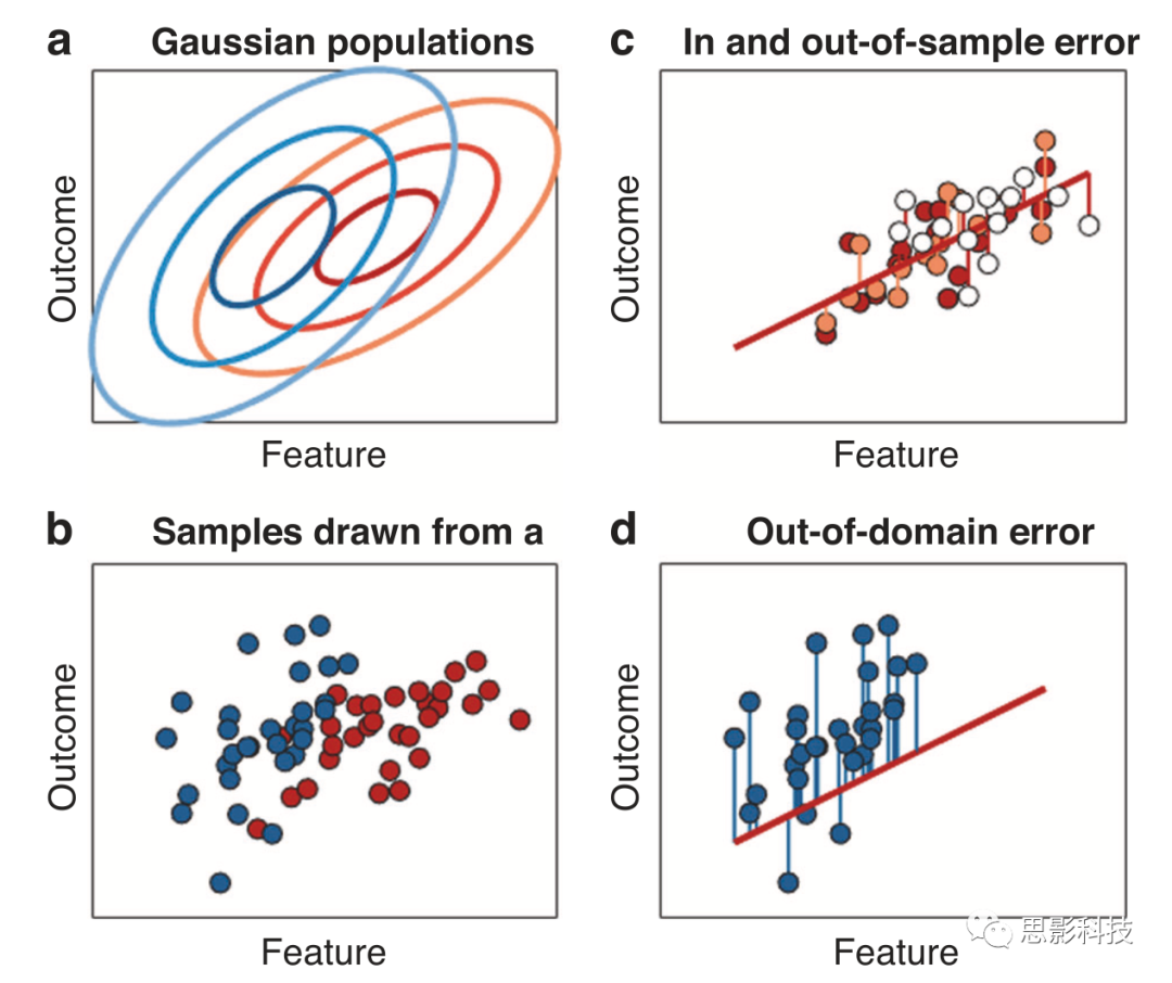 在醫(yī)療領(lǐng)域,當(dāng)我們?cè)噲D尋找新的生物標(biāo)志物時(shí),我們最終更關(guān)心的不是假設(shè)檢驗(yàn),而是預(yù)測(cè)。我們要求,在一組訓(xùn)練數(shù)據(jù)上訓(xùn)練的模型,如果我們將其應(yīng)用于之前訓(xùn)練集中不包含的新的觀察,它需要有助于正確的診斷,或確定最佳的治療形式。與用于模型訓(xùn)練的標(biāo)準(zhǔn)一樣,PE(預(yù)測(cè)誤差)可能基于不同類型的損失函數(shù),例如MSE損失或基于可能性的標(biāo)準(zhǔn)。至少有三種不同類型的預(yù)測(cè)我們需要區(qū)分(見(jiàn)圖3):樣本內(nèi)PE指的是我們保持一部分?jǐn)?shù)據(jù)固定的情況,例如預(yù)測(cè)值,其目的是確定這組給定的預(yù)測(cè)值的一組新的真實(shí)結(jié)果和預(yù)測(cè)結(jié)果之間的預(yù)期偏差(圖3c)。一個(gè)更有趣的量是樣本外PE,我們?cè)谝恍?shù)據(jù)上訓(xùn)練模型,然后繪制一個(gè)新樣本來(lái)評(píng)估PE(圖3c)。在這個(gè)過(guò)程中,我們經(jīng)常假設(shè)新樣本與訓(xùn)練樣本具有相同的統(tǒng)計(jì)特性,即來(lái)自相同的概率分布。然而,對(duì)于臨床實(shí)踐來(lái)說(shuō),情況可能并非如此。在這里,我們將其稱為“范圍外”P(pán)E(圖3d),只有當(dāng)我們擁有來(lái)自不同領(lǐng)域的數(shù)據(jù),或者我們擁有一個(gè)基于我們的樣本的過(guò)程的良好機(jī)制模型時(shí),才能現(xiàn)實(shí)地確定這一PE(預(yù)測(cè)誤差)。