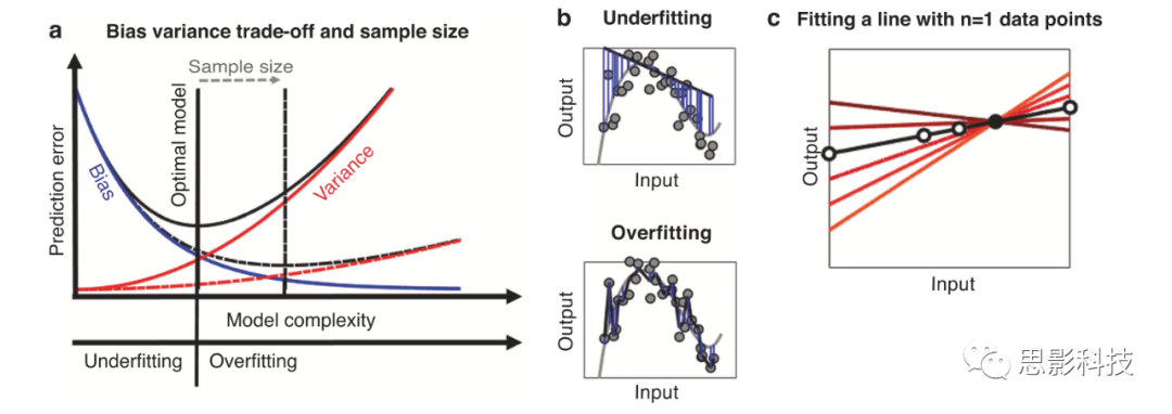 (a)隨著模型復(fù)雜性的增加(x軸),方差增大,偏差減小。我們希望選擇平衡這兩個(gè)量的(最優(yōu))模型,達(dá)到最小的預(yù)測(cè)誤差(y軸,最小的偏差加方差,黑色曲線)。增加樣本量有效地將這個(gè)最小值移向右邊(虛線),使模型具有更高的復(fù)雜性。