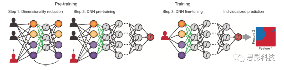 為了使用更復(fù)雜的FNN或RNN模型進(jìn)行量身定制的預(yù)測(cè),我們可以在多個(gè)個(gè)體上預(yù)訓(xùn)練。我們首先減少輸入維度,例如使用自動(dòng)編碼器(步驟1),然后對(duì)減少的大樣本輸入預(yù)訓(xùn)練DNN(步驟2)。然后在第三步對(duì)預(yù)訓(xùn)練的網(wǎng)絡(luò)對(duì)特定個(gè)體進(jìn)行微調(diào)。
