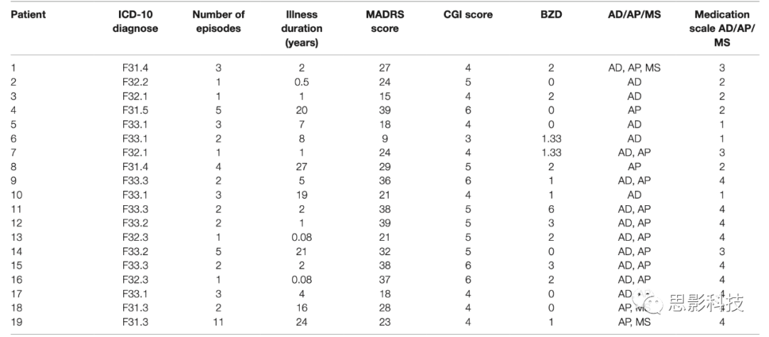 患者通常是在住院的第一周接受檢查,即在他們住院后和治療穩(wěn)定前的最短時(shí)間。所有患者都符合以下情感障礙中至少中度抑郁的標(biāo)準(zhǔn):雙相情感障礙(F31)、抑郁癥發(fā)作(F32)和復(fù)發(fā)性抑郁癥(F33)。