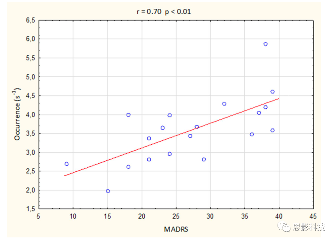 圖3.微狀態(tài)A的發(fā)生率與MADRS得分之間的相關(guān)性