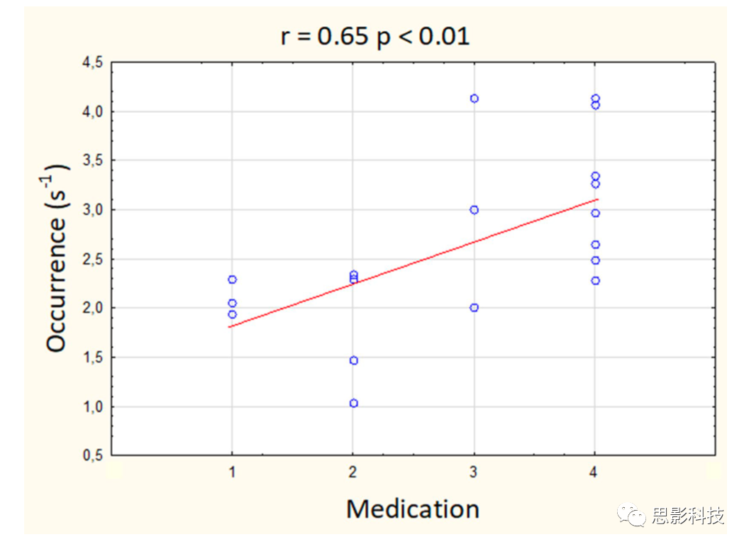 兩組在任何微狀態(tài)下的任何時(shí)間參數(shù)都沒有顯著差異。抑郁癥組與對(duì)照組沒有區(qū)別(所有t的絕對(duì)值<2.5)。FDR校正后的P值(六個(gè)微狀態(tài)類的六次比較)在患者組和對(duì)照組之間的任何微狀態(tài)的持續(xù)時(shí)間上都沒有顯著性差異狀(A:P=0.39;B:P=0.39;C:P=0.30;D:P=0.39;E:p=0.77;F:p=0.68),發(fā)生率(A:p=0.13;B:p=0.92;C:p =0.92;D:p =0.92;E:p=0.13;F:p=0.29),或覆蓋率(A:p=0.44;B:p=0.75;C:p=0.44;D:p=0.75;E:p=0.16;F:p=0.44)。Spearman等級(jí)相關(guān)的結(jié)果顯示,抑郁癥的嚴(yán)重程度與微狀態(tài)A的出現(xiàn)有正相關(guān),但與其他微狀態(tài)的出現(xiàn)沒有關(guān)系。微狀態(tài)A的出現(xiàn)與MADRS評(píng)分顯著相關(guān)(r=0.70,p<0.01;圖3),但與CGI評(píng)分(r=0.40)、病程(r=0.06)或發(fā)作次數(shù)(r=0.08)無關(guān)。抑郁癥的嚴(yán)重程度與微狀態(tài)A的持續(xù)時(shí)間或覆蓋范圍之間沒有顯著的關(guān)聯(lián)(所有r的絕對(duì)值<0.55)。Spearman等級(jí)相關(guān)的結(jié)果顯示,用藥情況與微狀態(tài)E的出現(xiàn)有顯著的正相關(guān),但與其他微狀態(tài)的出現(xiàn)沒有關(guān)系。微狀態(tài)E的發(fā)生率與抗抑郁藥、抗精神病藥和情緒穩(wěn)定劑的攝入量顯著相關(guān)(r=0.65,p<0.01;圖4),但與苯二氮卓類藥物的攝入量無關(guān)(r=0.20)。藥物治療狀況與微狀態(tài)E的持續(xù)時(shí)間或覆蓋率之間沒有顯著的關(guān)聯(lián)(所有r的絕對(duì)值<0.45)