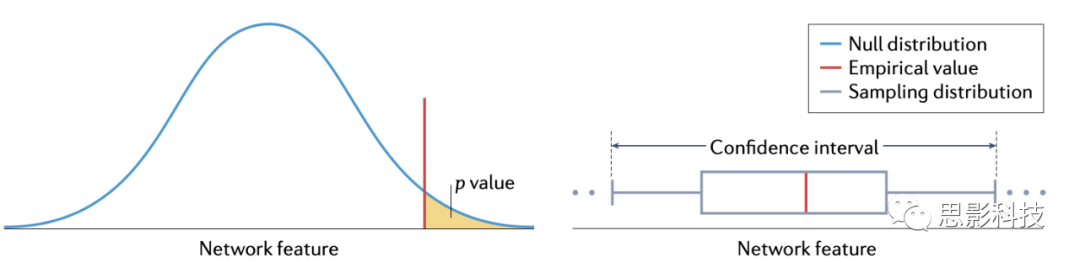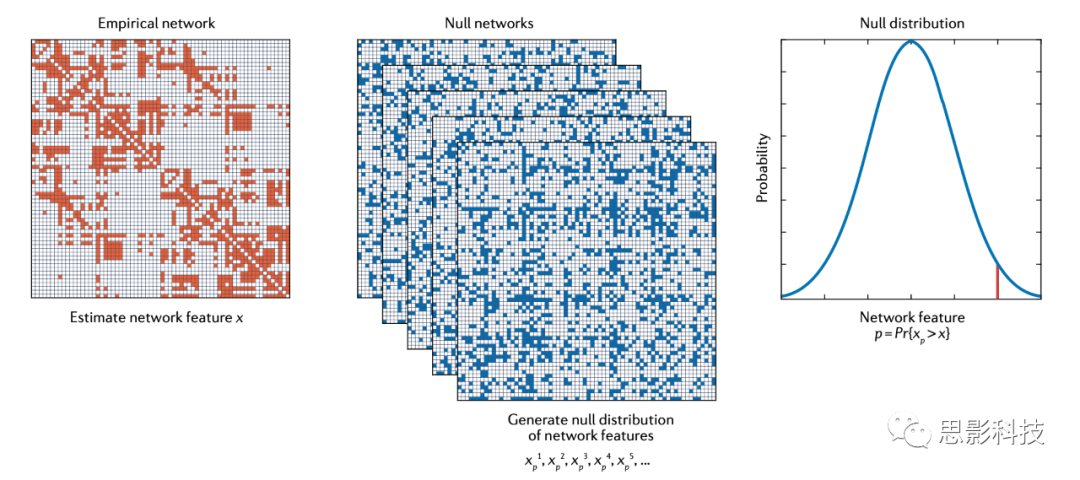 圖1概述了圖原假設(shè)檢驗(yàn)的過(guò)程。網(wǎng)絡(luò)特征(x,如路徑長(zhǎng)度或聚類系數(shù))首先在觀測(cè)網(wǎng)絡(luò)(紅色)上計(jì)算。為了評(píng)估該特征的統(tǒng)計(jì)意義,我們生成了一組零網(wǎng)絡(luò)(藍(lán)色),它們保留了觀測(cè)網(wǎng)絡(luò)的一些屬性(在本例中為密度)但系統(tǒng)地破壞了其他屬性(在本例中為拓?fù)浣Y(jié)構(gòu))。然后,我們?yōu)槊總€(gè)零網(wǎng)絡(luò)計(jì)算相同的網(wǎng)絡(luò)特征,在“該特征是由于密度而不是拓?fù)浣Y(jié)構(gòu)”的零假設(shè)下,生成特征x(xp)的分布。如果感興趣的特征x在觀測(cè)網(wǎng)絡(luò)中顯著大于或小于零網(wǎng)絡(luò),這就證明了特征x可以用零網(wǎng)絡(luò)中沒(méi)有保留的屬性來(lái)解釋。例如,如果我們發(fā)現(xiàn)觀測(cè)網(wǎng)絡(luò)始終比具有隨機(jī)拓?fù)浣Y(jié)構(gòu)但保留密度的空網(wǎng)絡(luò)顯示出更大的聚類,我們就可以認(rèn)為:觀測(cè)網(wǎng)絡(luò)中的聚類是由于拓?fù)浣Y(jié)構(gòu)引起的,而不是密度引起的。p值為分布xp大于或等于x的的概率。