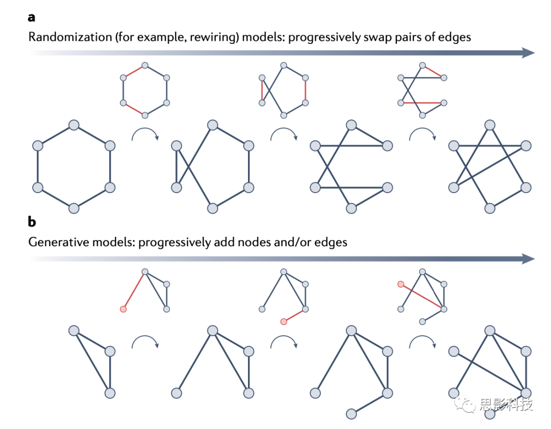 盡管在實(shí)現(xiàn)上存在差異,但隨機(jī)和生成模型形成了一套連貫的分析工具,用于制定和完善有關(guān)網(wǎng)絡(luò)結(jié)構(gòu)的假設(shè)。在隨機(jī)模型中,我們系統(tǒng)地隨機(jī)化那些我們假設(shè)對(duì)我們研究的網(wǎng)絡(luò)特征很重要的因素,并保留那些假設(shè)不重要的因素。在生成模型中,我們系統(tǒng)地添加我們假設(shè)為重要的最小因素集。從這個(gè)意義上講,隨機(jī)模型和生成模型之間的差異類似于統(tǒng)計(jì)學(xué)中非參數(shù)檢驗(yàn)和參數(shù)檢驗(yàn)之間的差異。對(duì)于生成模型,就像在參數(shù)檢驗(yàn)中一樣,我們明確定義了數(shù)據(jù)生成的過(guò)程,并假設(shè)零分布可以由一小組參數(shù)捕獲。對(duì)于隨機(jī)模型,如在非參數(shù)檢驗(yàn)中,我們不做關(guān)于零分布的假設(shè),而是使用一些隨機(jī)過(guò)程從觀測(cè)數(shù)據(jù)中組合出一個(gè)零分布。隨著時(shí)間的推移,隨機(jī)模型逐漸變得更加穩(wěn)健,它們有助于縮小假設(shè)范圍,并為生成模型提供有用信息。