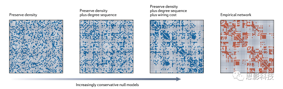 鑒于有許多可供選擇的零模型,我們?nèi)绾芜x擇適當(dāng)?shù)哪P妥鳛橛^測(cè)網(wǎng)絡(luò)的參考框架呢?圖3展示了一個(gè)觀測(cè)網(wǎng)絡(luò),以及三個(gè)保留網(wǎng)絡(luò)特性逐漸增多的不同零模型。第一個(gè)零模型是一個(gè)隨機(jī)圖,只保留密度。第二個(gè)零模型是Maslov-Sneppen重布線零模型,保留了密度和度序列。注意,與隨機(jī)零空間相比,重布線的零空間具有顯著的水平和垂直條紋,這與觀測(cè)網(wǎng)絡(luò)中的條紋類似,因?yàn)樵谟^測(cè)網(wǎng)絡(luò)中作為hubs的節(jié)點(diǎn)在重布線的網(wǎng)絡(luò)中仍然是hubs。第三個(gè)零模型,保留了網(wǎng)絡(luò)的密度、度和總的布線成本,顯示了與觀測(cè)網(wǎng)絡(luò)類似的結(jié)構(gòu)。換句話說(shuō),當(dāng)增加對(duì)零模型的約束時(shí),我們將產(chǎn)生更多關(guān)于原始圖的真實(shí)表示,從而產(chǎn)生一個(gè)更穩(wěn)健的零模型。這導(dǎo)致了更嚴(yán)格的測(cè)試,以識(shí)別更細(xì)粒度的影響,這可以解釋原始數(shù)據(jù)中方差的逐漸減少。這個(gè)例子說(shuō)明了零模型的兩個(gè)重要特性。首先,零模型存在于一個(gè)范圍內(nèi),范圍從不確定的零到穩(wěn)健的零,這取決于施加的約束。其次,零模型是一種系統(tǒng)地對(duì)更大的潛在網(wǎng)絡(luò)空間進(jìn)行采樣的方法,并將觀測(cè)網(wǎng)絡(luò)置于這個(gè)空間中。