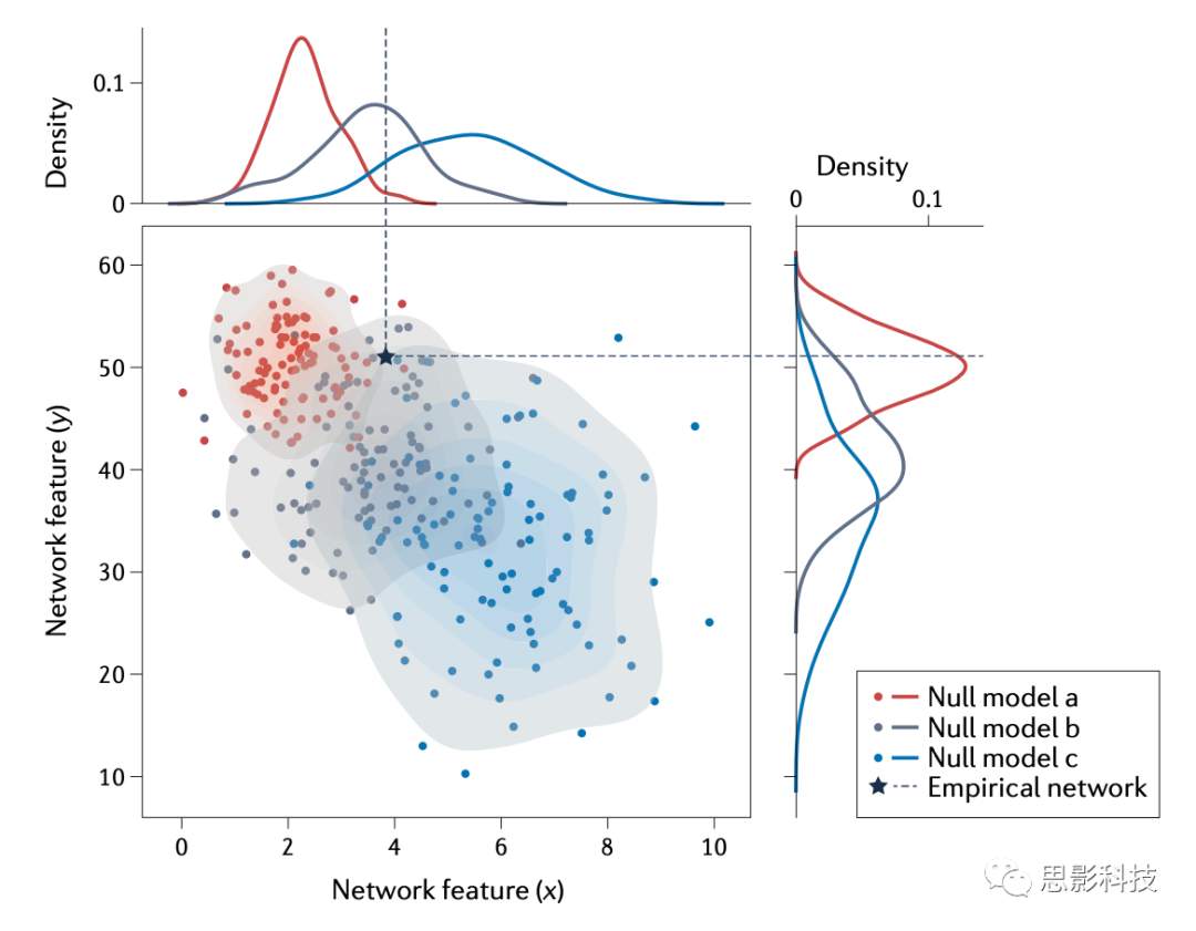 更一般地說(shuō),構(gòu)建零模型的過(guò)程可以認(rèn)為是從具有相關(guān)特征的更廣泛的可能網(wǎng)空間中進(jìn)行采樣(圖4)。這個(gè)多維網(wǎng)絡(luò)形態(tài)空間由代表特定網(wǎng)絡(luò)特性的或特征生成。這個(gè)空間中的每個(gè)點(diǎn)或位置都代表著不同的網(wǎng)絡(luò)形態(tài),其中一些可以在所需約束條件下實(shí)現(xiàn),而另一些不能。該空間中的鄰近性反映了網(wǎng)絡(luò)形態(tài)之間的相似性。零模型約束的數(shù)量和嚴(yán)格程度決定了該空間中將由零模型實(shí)例化填充的部分;例如,嚴(yán)格的模型將位于經(jīng)驗(yàn)網(wǎng)絡(luò)附近,而較寬松的模型將位于更遠(yuǎn)的地方。因此,無(wú)論是通過(guò)重布線還是生成機(jī)制實(shí)現(xiàn)的零模型,都是從該網(wǎng)絡(luò)形態(tài)空間的不同部分進(jìn)行系統(tǒng)采樣并為所需網(wǎng)絡(luò)特征生成零分布的方法。探索這個(gè)空間使我們能夠量化不同的約束和生成機(jī)制對(duì)觀測(cè)網(wǎng)絡(luò)的特定特征的貢獻(xiàn)。