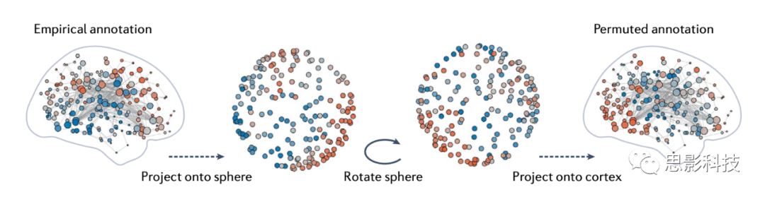空間置換試驗(yàn),也稱為“自旋試驗(yàn)”,通過(guò)隨機(jī)旋轉(zhuǎn)大腦空間標(biāo)注圖的球形剖面來(lái)隨機(jī)化網(wǎng)絡(luò)結(jié)構(gòu)和空間標(biāo)注之間的關(guān)系(圖5)。這些模型利用皮質(zhì)表面提取過(guò)程中產(chǎn)生的球坐標(biāo)將大腦區(qū)域或頂點(diǎn)投射到一個(gè)球體上。在球體的隨機(jī)旋轉(zhuǎn)之后,通過(guò)將每個(gè)坐標(biāo)分配給其最近的旋轉(zhuǎn)對(duì)應(yīng)的位置而獲得了一個(gè)變體。通過(guò)對(duì)兩個(gè)大腦半球應(yīng)用相同的(鏡像)隨機(jī)旋轉(zhuǎn),空間置換模型(大約)保持了大腦半球的對(duì)稱性。最終得到的標(biāo)注圖保留了網(wǎng)絡(luò)結(jié)構(gòu),保留了標(biāo)注的空間自相關(guān)性,但網(wǎng)絡(luò)節(jié)點(diǎn)與標(biāo)注的對(duì)應(yīng)關(guān)系是隨機(jī)的(圖5)。這個(gè)測(cè)試最初是在曲面頂點(diǎn)層面開(kāi)發(fā)的,隨后擴(kuò)展到區(qū)域?qū)用?/span>——即分塊數(shù)據(jù)。值得注意的是,區(qū)域?qū)哟紊峡臻g置換模型的不同實(shí)現(xiàn)方式在特定的方法論決策上存在分歧,例如如何處理內(nèi)側(cè)壁,或者它們是否允許多次分配注釋值。