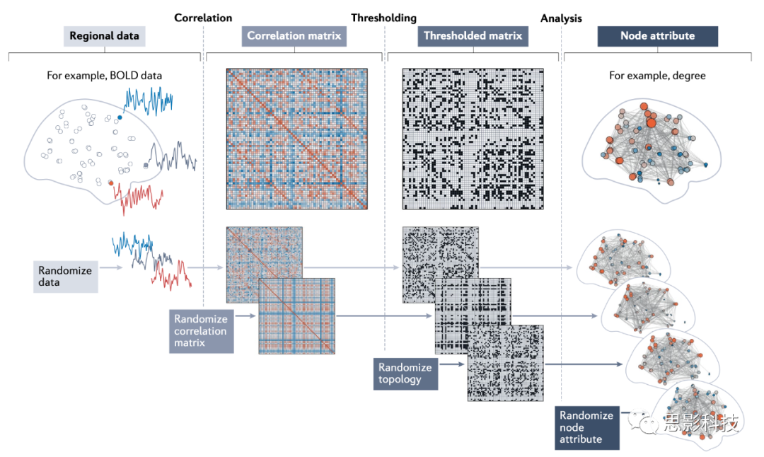 總體而言,這些方法展示了一個(gè)重要的點(diǎn):某些類型的網(wǎng)絡(luò)可以在構(gòu)建和分析管道的不同層次上被隨機(jī)化(圖6)。結(jié)構(gòu)網(wǎng)絡(luò)和注釋網(wǎng)絡(luò)的零模型傾向于對(duì)網(wǎng)絡(luò)本身的邊或節(jié)點(diǎn)進(jìn)行操作,而相關(guān)性網(wǎng)絡(luò)的許多零模型還可以在網(wǎng)絡(luò)構(gòu)建的早期中進(jìn)行操作,比如說(shuō)相關(guān)的生理時(shí)間序列或解剖特征向量。通過(guò)將分析工作流應(yīng)用于隨機(jī)輸入數(shù)據(jù),在網(wǎng)絡(luò)構(gòu)建的早期階段應(yīng)用零模型仍可用于生成派生統(tǒng)計(jì)的隨機(jī)實(shí)例。例如,隨機(jī)化的替代時(shí)間序列可用于構(gòu)建一個(gè)相關(guān)矩陣、一個(gè)二元網(wǎng)絡(luò)和一個(gè)區(qū)域節(jié)點(diǎn)度map,每一個(gè)都是相對(duì)于它們的經(jīng)驗(yàn)對(duì)應(yīng)變量隨機(jī)化得到的(圖6)。另外,經(jīng)驗(yàn)相關(guān)矩陣(或衍生的二元拓?fù)浣Y(jié)構(gòu)或節(jié)點(diǎn)屬性)也可以直接隨機(jī)化(圖6)。最重要的是,這些不同的零模型可以同時(shí)進(jìn)行評(píng)估,以更全面地評(píng)估感興趣的經(jīng)驗(yàn)特征。
