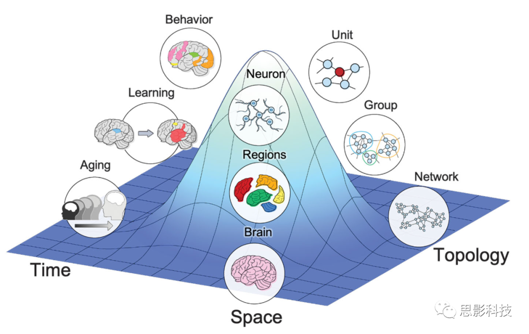 大腦系統(tǒng)的不同組織形式是多維的。這里說(shuō)明了三種類型的維度或?qū)哟危?b>時(shí)間、空間和拓?fù)?/span>。從上到下,各個(gè)組織層次的尺度從微觀到宏觀。
