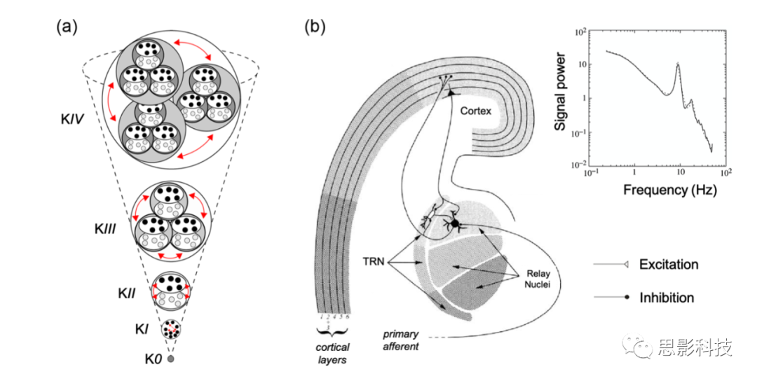 (a)所謂的k層次結(jié)構(gòu)顯示了從細(xì)胞水平到整個(gè)大腦的模型進(jìn)程。K0是一個(gè)不相互作用的神經(jīng)元集合。KI對(duì)應(yīng)的是具有足夠功能連接密度的皮層柱。KII代表興奮性和抑制性群體的集合。KIII由多個(gè)KII集合相互作用形成。KIV是由三個(gè)KIII集合相互作用形成的,它們模擬了意圖行為的簡(jiǎn)單形式的起源。