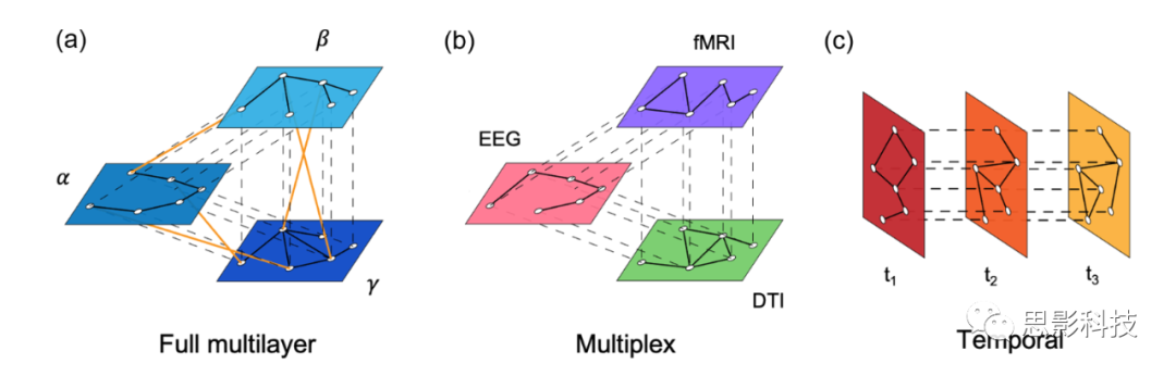 最新的多層大腦網(wǎng)絡(luò)主要來(lái)源于人類的實(shí)驗(yàn)神經(jīng)成像數(shù)據(jù),節(jié)點(diǎn)代表相同的實(shí)體。這種類型的表示主要用于描述多模態(tài)大腦網(wǎng)絡(luò),其不同層次可能包含不同結(jié)構(gòu)和功能連接,以及不同頻率。由功能磁共振成像和腦電圖信號(hào)派生的大腦網(wǎng)絡(luò),其中節(jié)點(diǎn)分別對(duì)應(yīng)圖像體素和腦電傳感器。與多模態(tài)大腦網(wǎng)絡(luò)不同的是,時(shí)變大腦網(wǎng)絡(luò)的各層并不對(duì)應(yīng)于不同的空間或時(shí)間頻率尺度,但它們通常在固定的時(shí)間分辨率內(nèi)捕捉到網(wǎng)絡(luò)的動(dòng)態(tài)演化。對(duì)于運(yùn)動(dòng)行為來(lái)說(shuō),這通常是毫秒級(jí)的,對(duì)于人類學(xué)習(xí)來(lái)說(shuō)是幾分鐘到幾小時(shí),對(duì)于衰老和神經(jīng)退行性疾病來(lái)說(shuō)是幾年的。