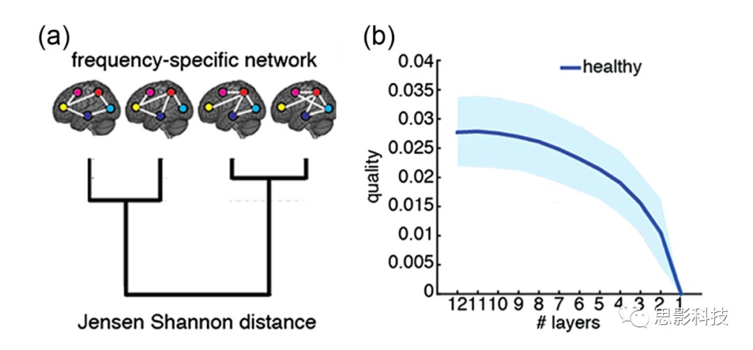 多層網(wǎng)絡(luò)比標(biāo)準(zhǔn)網(wǎng)絡(luò)方法提供了更豐富的描述,但它們真的代表著在大腦組織建模方面向前邁進(jìn)了一步嗎?是否所有的層都是捕獲主要組織屬性所必需的?De Domenico, Nicosia等人(2015)通過(guò)引入一種結(jié)構(gòu)可約性方法來(lái)解決這些問(wèn)題,該方法可以使多層網(wǎng)絡(luò)的層與層之間的非冗余拓?fù)湫畔⑾鄬?duì)于其聚合對(duì)應(yīng)物的數(shù)量最大化[圖4(a)]。對(duì)于大量的網(wǎng)絡(luò),從蛋白質(zhì)相互作用到社交網(wǎng)絡(luò),結(jié)構(gòu)可約性表明,從可區(qū)分性角度來(lái)看,最佳配置不一定是層數(shù)最多的那個(gè)。相反,由fMRI信號(hào)衍生的多頻大腦網(wǎng)絡(luò)不容易約簡(jiǎn),因?yàn)樗袑佣紟?lái)了一些非冗余的拓?fù)湫畔?/span>[圖4(b)]。