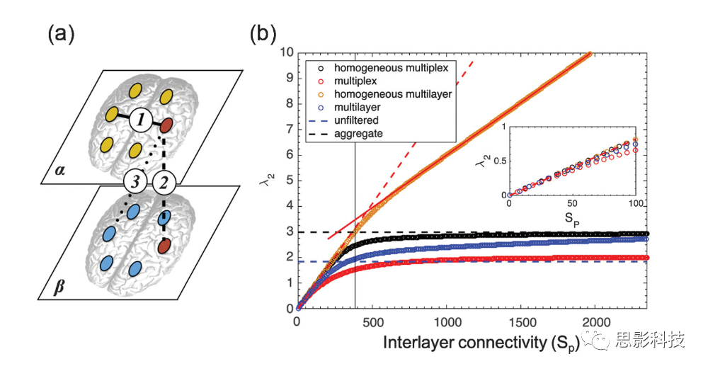 (b)代數(shù)連通性λ2作為層間總連通性(Sp)的函數(shù)。