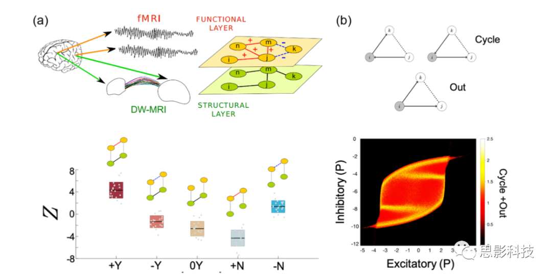 但是,由結(jié)構(gòu)層和功能層組成的多層網(wǎng)絡(luò)的高階拓?fù)涮匦允鞘裁?/span>?為了解決這些問(wèn)題,Battiston等人(2017)首先研究了DTI-fMRI多模態(tài)網(wǎng)絡(luò)各層間形成的簡(jiǎn)單連接的存在。他們發(fā)現(xiàn),包括結(jié)構(gòu)連接和正相關(guān)功能連接的基序在人腦中過(guò)多[圖6(a)]。這證實(shí)了解剖學(xué)連接的存在很可能導(dǎo)致相應(yīng)大腦區(qū)域之間的同步活動(dòng)。總的來(lái)說(shuō),結(jié)果表明,大腦的內(nèi)在功能組織受到基礎(chǔ)解剖網(wǎng)絡(luò)的顯著限制,不能僅用它來(lái)解釋。