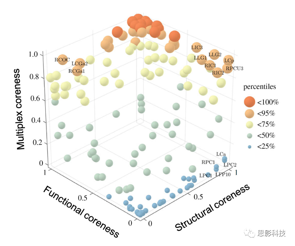 圖7 人類連接組的多重核心-外圍結(jié)構(gòu)。從結(jié)構(gòu)層(DTI)和功能層(fMRI)獲得的多層核心與單層核心的散點(diǎn)圖。