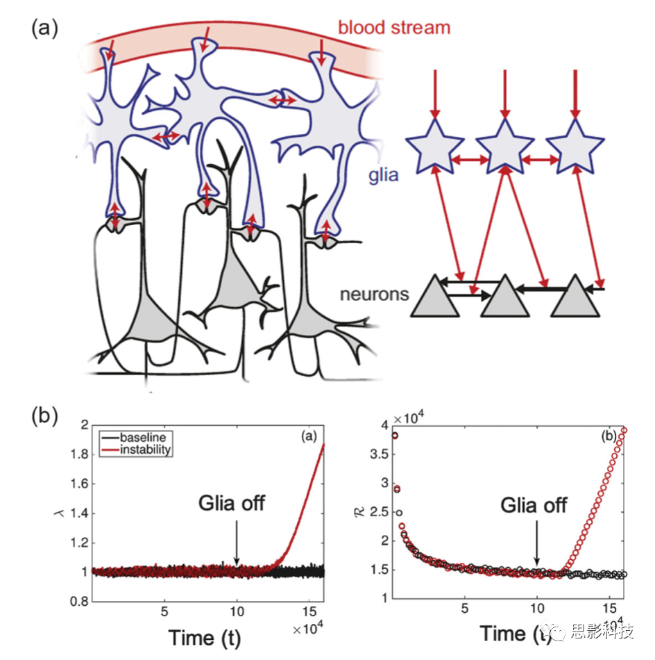 (a)左側(cè):神經(jīng)膠質(zhì)細(xì)胞將代謝資源從血流重新分配到神經(jīng)突觸。右側(cè):雙層網(wǎng)絡(luò)模型。黑色箭頭表示神經(jīng)突觸的相互作用。