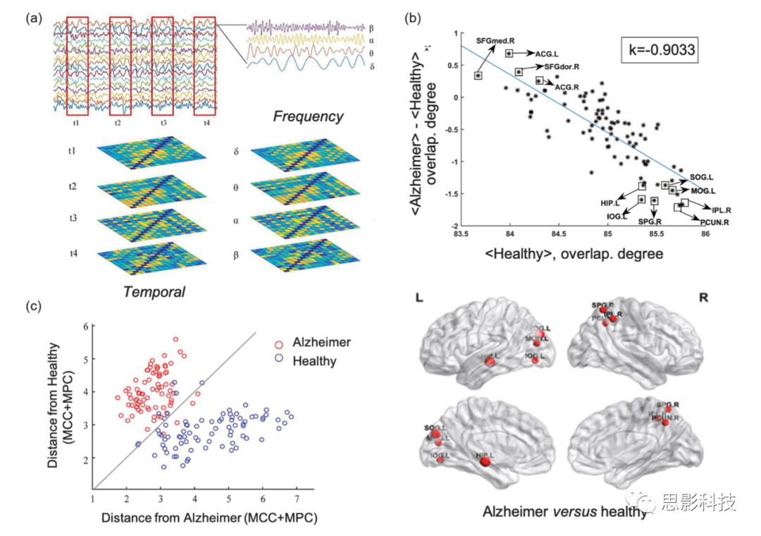 (b)上:阿爾茨海默病患者腦磁圖多頻網(wǎng)絡(luò)中樞中斷。下:重疊加權(quán)程度組間差異顯著的腦區(qū)。