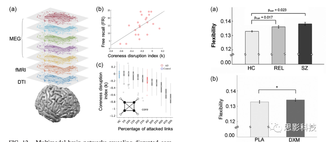 (2)神經(jīng)精神障礙:在神經(jīng)精神疾病中,精神分裂癥由于其龐大的人口發(fā)病率,無(wú)疑是研究最多的疾病之一。典型的臨床癥狀包括幻覺(jué)、情緒遲鈍、言語(yǔ)和思想混亂。在大的空間尺度上,低頻和高頻神經(jīng)元振蕩,以及它們的相互作用,已被廣泛記錄為精神分裂癥神經(jīng)病理學(xué)的核心特征。De Domenico、Sasai和Arenas(2016)使用多重方法首次從靜息態(tài)fMRI衍生的多頻率網(wǎng)絡(luò)中提供了精神分裂癥拓?fù)渥兓木C合表征。他們?cè)u(píng)估了多重PageRank中心性,并顯示了大腦最重要的多頻率中樞的大量重組,包括楔前葉皮層,這是大腦基本生理組織的關(guān)鍵區(qū)域。在調(diào)查時(shí)間功能磁共振成像網(wǎng)絡(luò)時(shí),Braun等人(2016)表明,與健康受試者相比,精神分裂癥患者在工作記憶任務(wù)中表現(xiàn)出多重網(wǎng)絡(luò)靈活性的增加,工作記憶任務(wù)通常用于評(píng)估認(rèn)知缺陷的神經(jīng)基礎(chǔ)[圖13(a)]。Braun等人在實(shí)驗(yàn)上阻斷另一組健康受試者的谷氨酸敏感突觸受體(NMDA受體)時(shí),能夠重現(xiàn)同樣的超靈活性[圖13(b)]??偟膩?lái)說(shuō),這些發(fā)現(xiàn)首次表明,精神分裂癥患者的微尺度興奮-抑制失衡實(shí)際上可能轉(zhuǎn)化為時(shí)間不穩(wěn)定的、可能解體的大規(guī)模大腦重組。